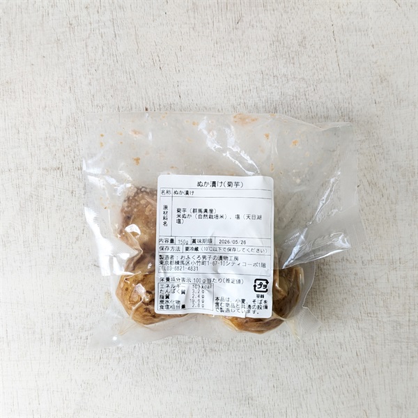自然栽培の米ぬかを使い、自然栽培の野菜と天日湖塩で12年かけて育てたぬか床に、自然栽培菊芋をじっくり漬け込みました。酸味が強めの昔ながらの味わいです。