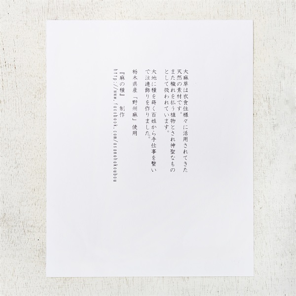 2011年に麻農家さんと出会い、麻の手仕事を始めた「麻の種」。国産の大麻草を使い注連縄やアクセサリーを制作しています。