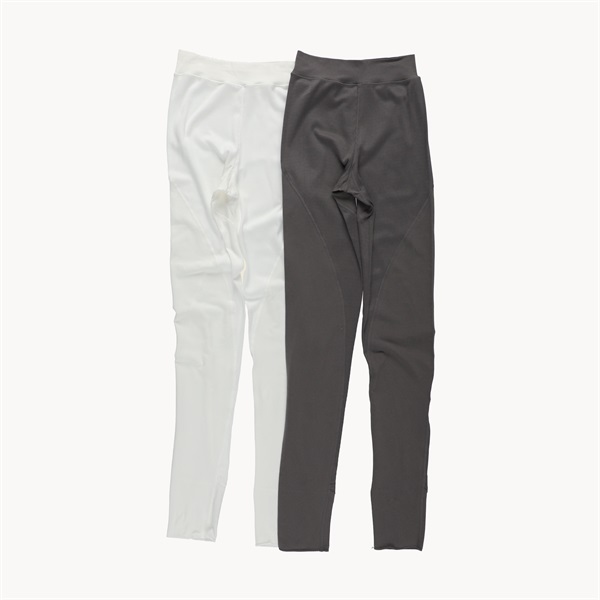 伸縮性の異なる2枚の生地を繋ぎ合わせた、特殊なパターンのレギンスです。膝やお尻、足首など、動きのある箇所には弾性の高い生地を使用し、それ以外の部分にはコットン100%の生地を使用しています。ピッタリと体にフィットしながらも、やわらかく締め付けないゆったりとした着心地です。