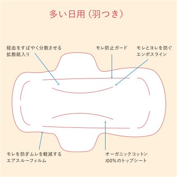 多い日でもしっかり固定でき安心して使える設計。経血を逃さない十分な厚みがありつつ、裏面にエアスルーフィルムを採用することでムレを抑え、肌への負担を軽減してくれます。