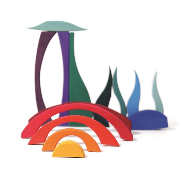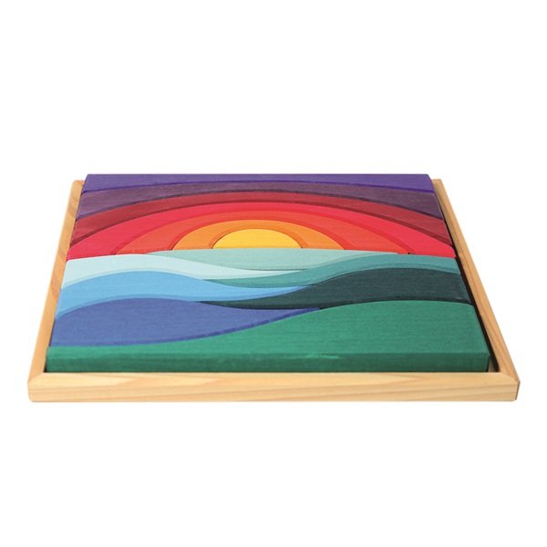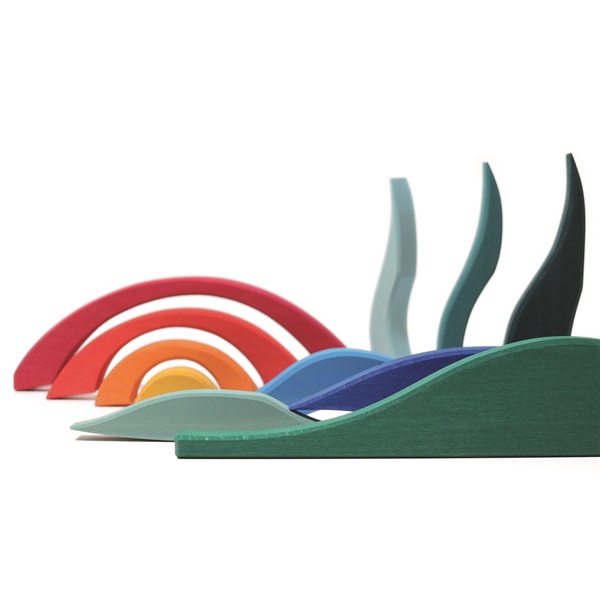 太陽、海、空のパーツを自由に組み合わせて、自由に風景をつくることができる積み木です。他のおもちゃとも組み合わせながら遊ぶこともできます。丘や山、水や木などの風景から、門や城など建物まで、自由な形づくりが子どもたちの想像力や思考力を育んでくれます。
