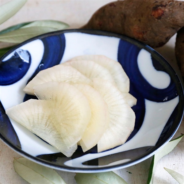 見た目はさつまいものようですが、果肉は白く、生で食べられる珍しい根菜です。シャキシャキとした食感と、ほんのり梨を思わせる優しい甘さが楽しめます。