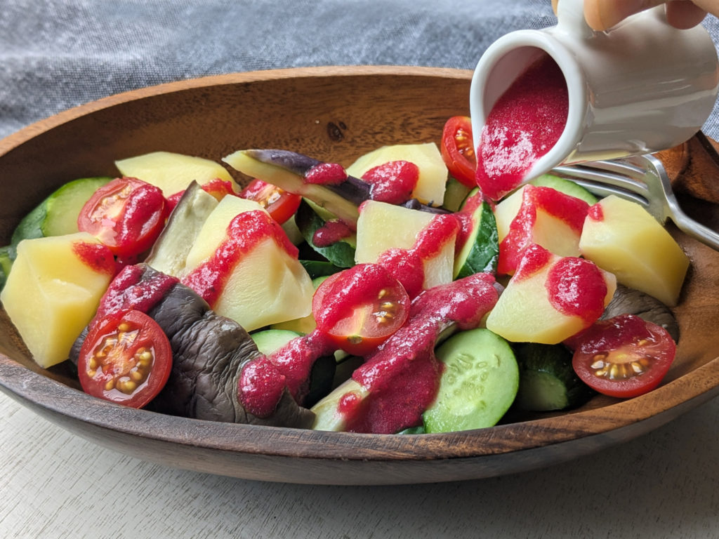 鮮やかなビーツの色合いがサラダを華やかに彩ります。見た目にもきれいな一品です。