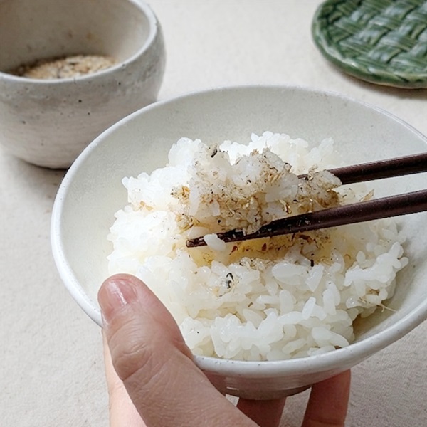 煎り塩のみで加工し、国産のかつおぶし、しその葉、椎茸、わかめ、白胡麻をまぜあわせました。ご飯にまぶして・お茶漬け・お弁当・お酒のおつまみに。