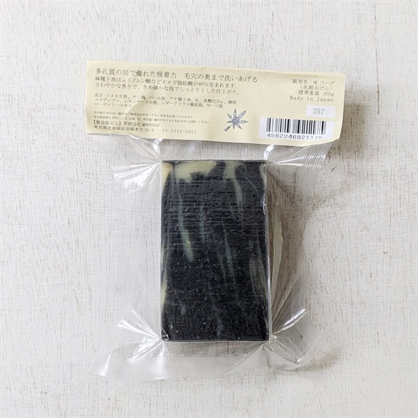 米ぬか油、ヤシ油(ココナッツ油)、水、パーム油、アサ種子油、※水酸化Na、麻炭、コメデンプン、レモンマートル油、シダーアトラス樹皮油、セージ油、ローズマリーエキス