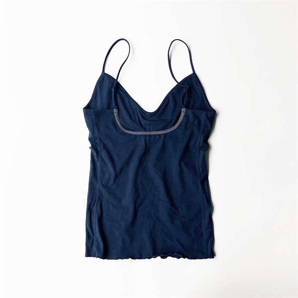 希少なギザコットンを使用したコットン100%のブラキャミソールです。さらりとした生地は、季節を問わずインナーとしてご使用いただけます。バックオープンのデザインで、背中が広く開いたトップスに合わたり、シアーなトップスの下に透けさせてレイヤードスタイルもお楽しみいただけます。背中はグレーのパイピングを施した、バイカラーのデザインです。