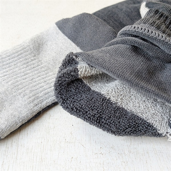 足首・甲部分はリブ編みになっているので、柔らかく足を包み込むようなホールド感があります。裏はパイル編みで仕上げられており、クッションのような柔らかさと優しい肌触りが特徴です。汗を吸収して適度に放湿することで、長時間履いてもさらりとして快適です。
