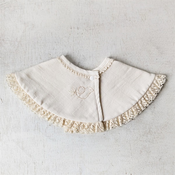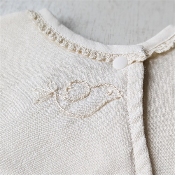 新生児から一歳過ぎ頃まで長く使えるスタイです。使用しているレースまで、すべてオーガニックコットン100%。首元には二ヶ所の調節ボタンを備え、成長や首周りのサイズに合わせて快適にフィット。ガーゼ4枚分の厚みがありながら、驚くほど柔らかく、デリケートな赤ちゃんの肌にもやさしくなじみます。